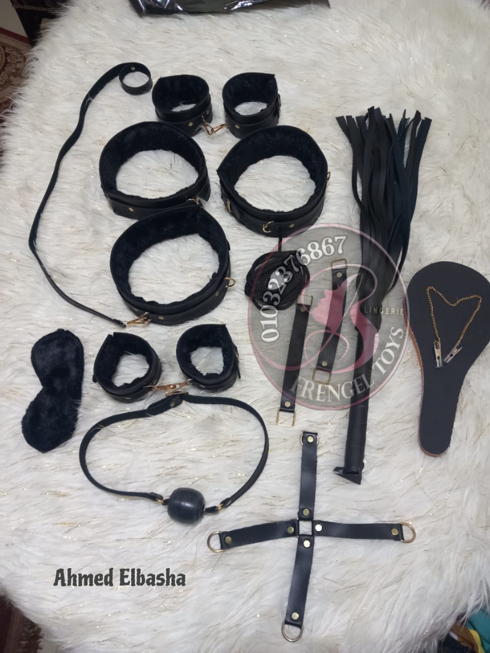 متاح طقم قيود 12 قطعه الماني جلد تقيل مطبطن فرو ناعم حرير اكسسوار دهبي محمل تقيل كوالتي عالي جدا محتويات الطقم 1 كلبش ايد يمين وشمال 2 كلبش رجل يمين وشمال 3 كرباج 4 مضرب 5 كمامة فم أو كلبش الفم 6 رقبه بالشداد 7 مشبك حلمات صدر 8 الجديد شداد الرقبه لكلبش الايد والرجل 9 صليبه رباعية 10 وصلتين لكلبش الأيدي والرجل 11 فخده يمين 12 فخده شمال 13 حبل تكتيف 14 غمامة عين